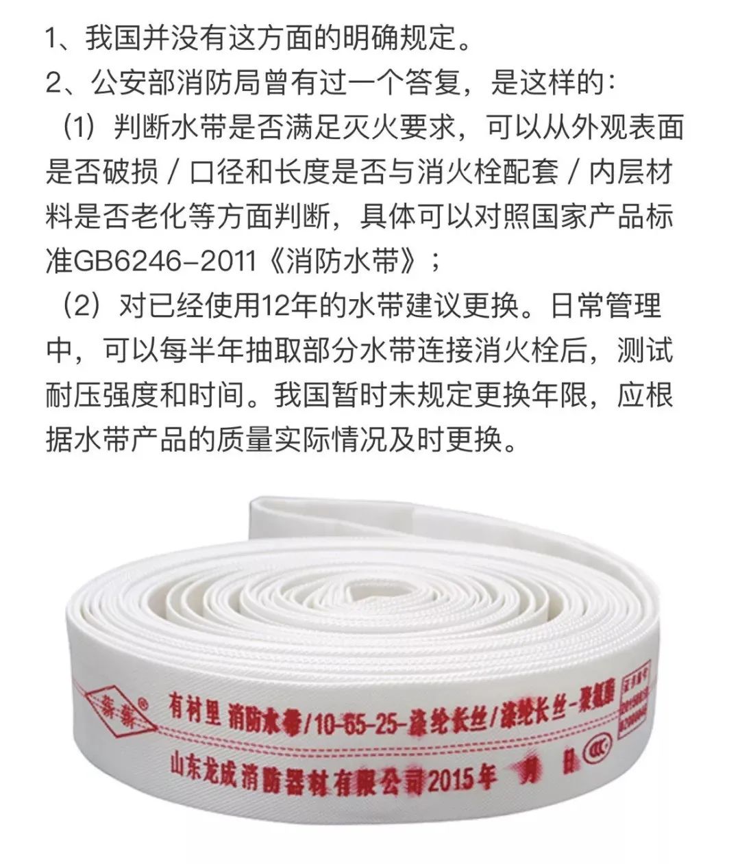 根據(jù)標(biāo)準(zhǔn),消防水帶沒(méi)有具體的報(bào)廢年限,但是應(yīng)根據(jù)水帶的實(shí)際耗損情況及時(shí)更換。